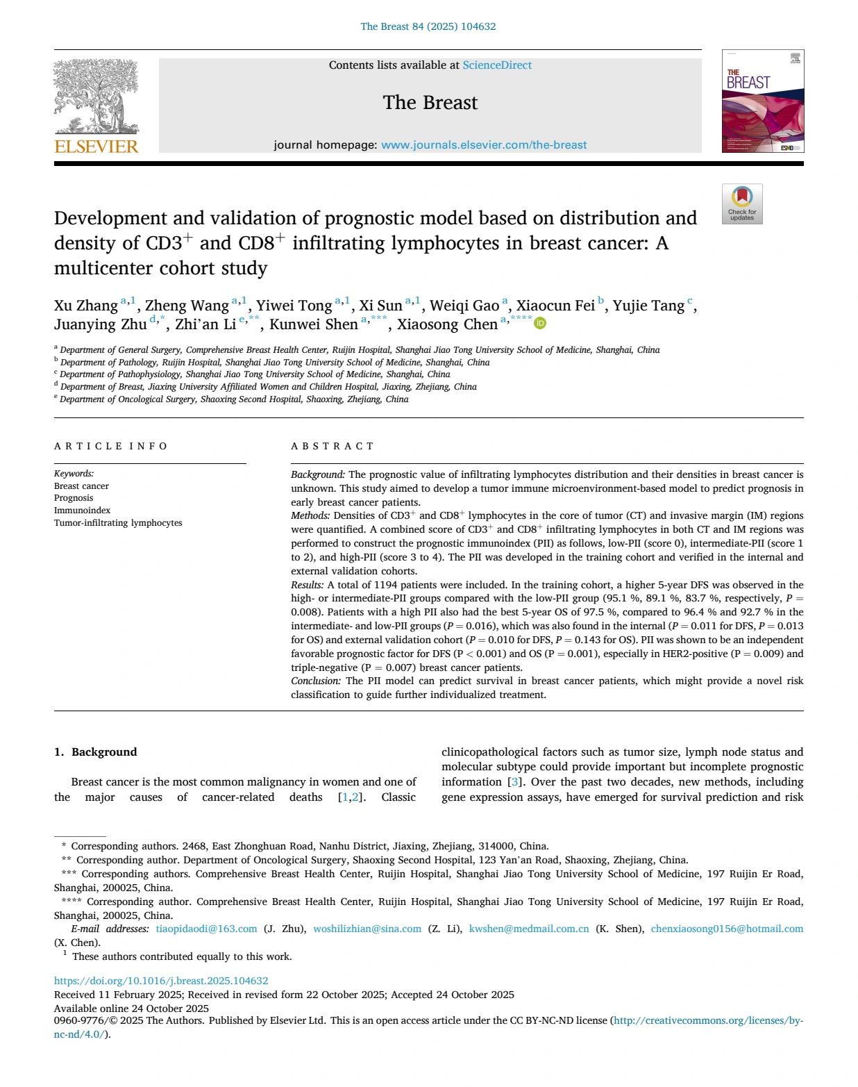 “I am happy to announce that our new research, titled ‘Development and validation of prognostic model based on distribution and density of CD3+ and CD8+ infiltrating lymphocytes in breast cancer: A multicenter cohort study’, has been published in The Breast.