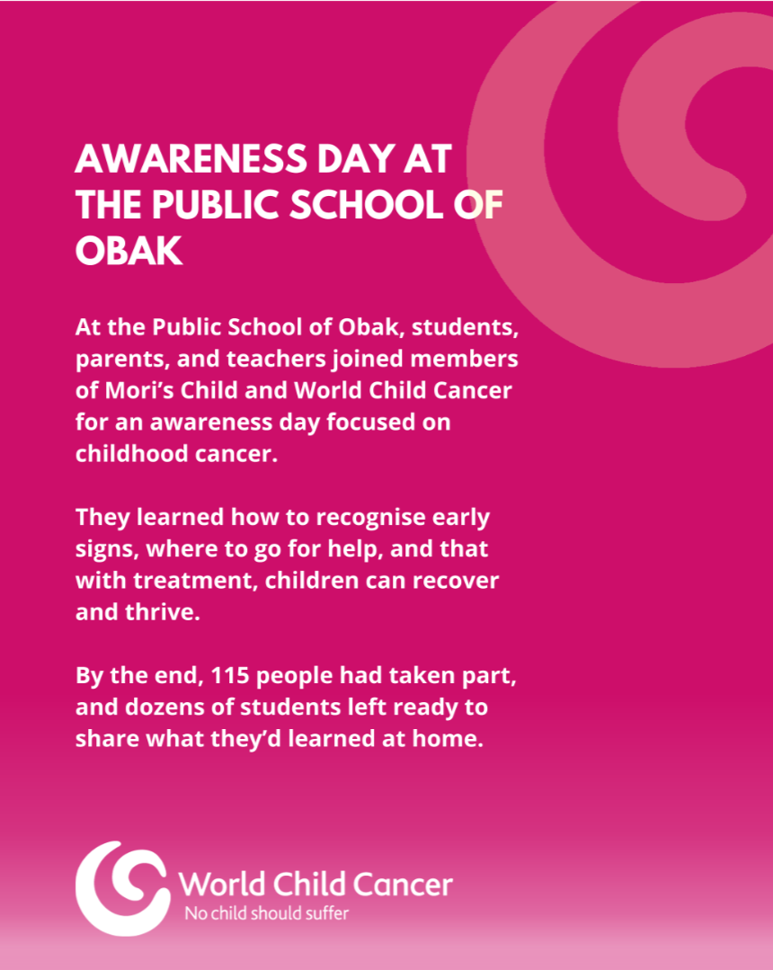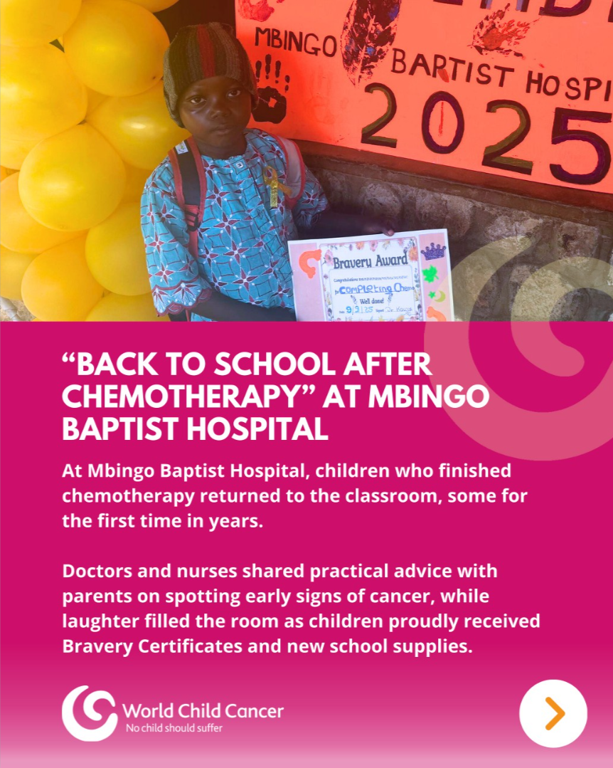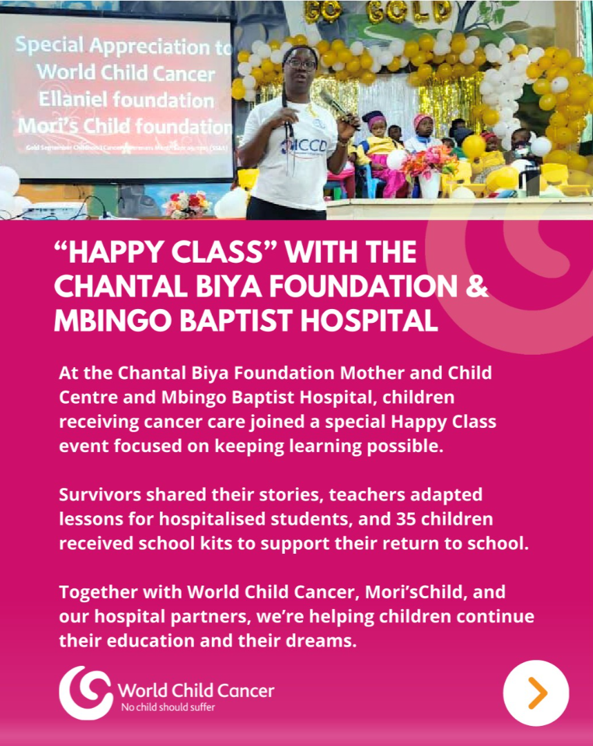 With support from World Child Cancer and Amgen (Sean Lybrand, Philip Anderson, Ponda Motsepe-Ditshego, MD), and in partnership with Mbingo Baptist Hospital, Chantal Biya Foundation Mother and Child Centre, Mori’sChild, and Action Against Childhood Cancer Cameroon (AACC), these activities are strengthening holistic care, combining early diagnosis and expert treatment with psychosocial and educational support that helps children recover in every sense of the word.