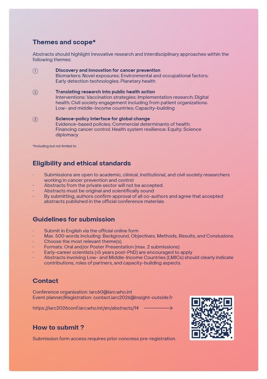 “Call for Abstracts for IARC@60 International Scientific Conference: Cancer Research into Action Lyon, France, 19-21 May 2026.
