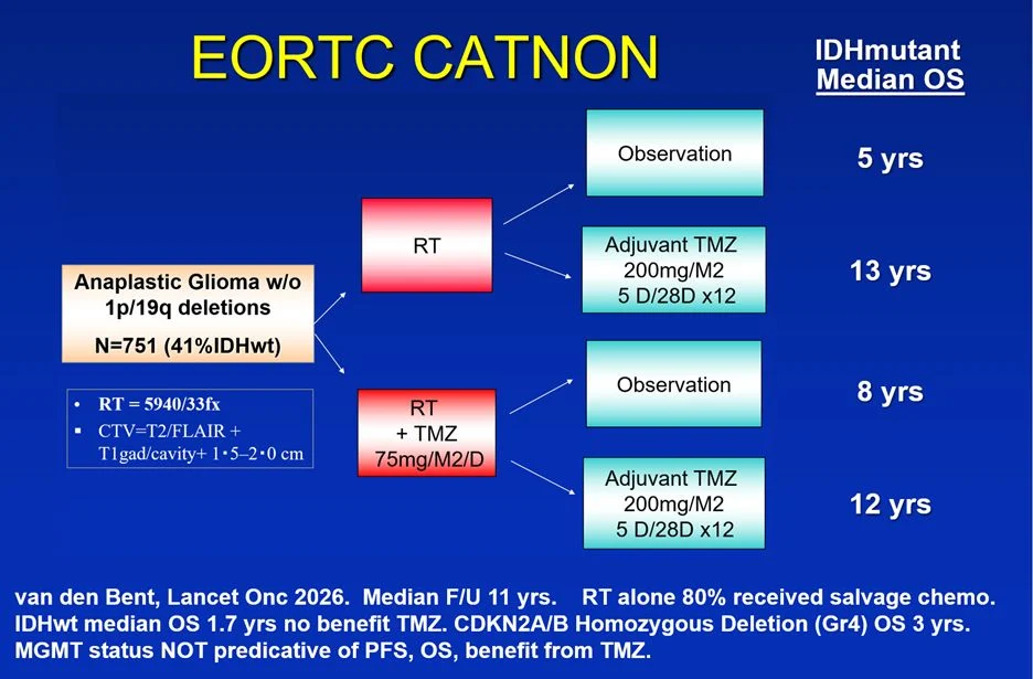 Title: Concurrent and adjuvant temozolomide for 1p/19q non-co-deleted anaplastic glioma (CATNON; EORTC study 26053-22054): final and exploratory analyses of a randomised, open-label, phase 3 trial