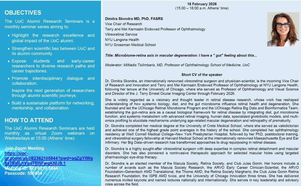 The first seminar will be delivered by Prof. Dimitra Skondra (NYU Grossman School of Medicine) and will explore the microbiome–retina axis in macular degeneration.