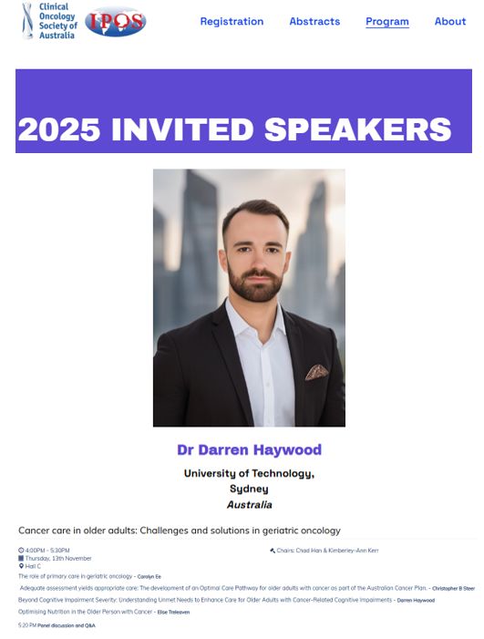I am excited to be giving an invited talk on cognition in older people affected by cancer in an excellent session, which includes talks from Carolyn Ee, Christopher Steer, and Elise Treleaven.