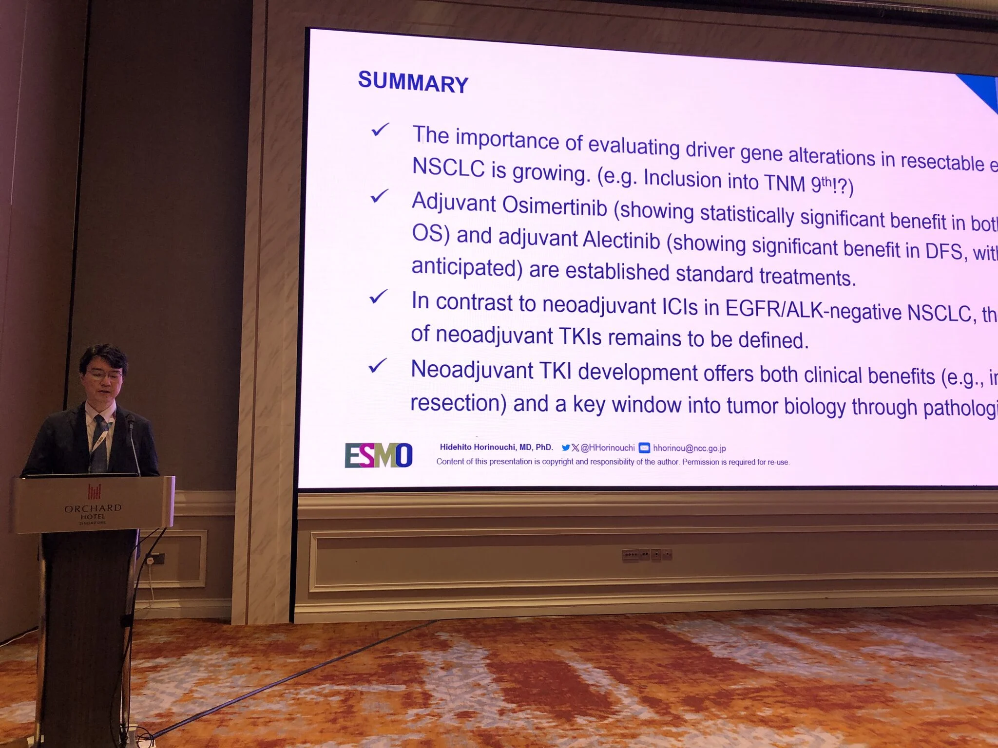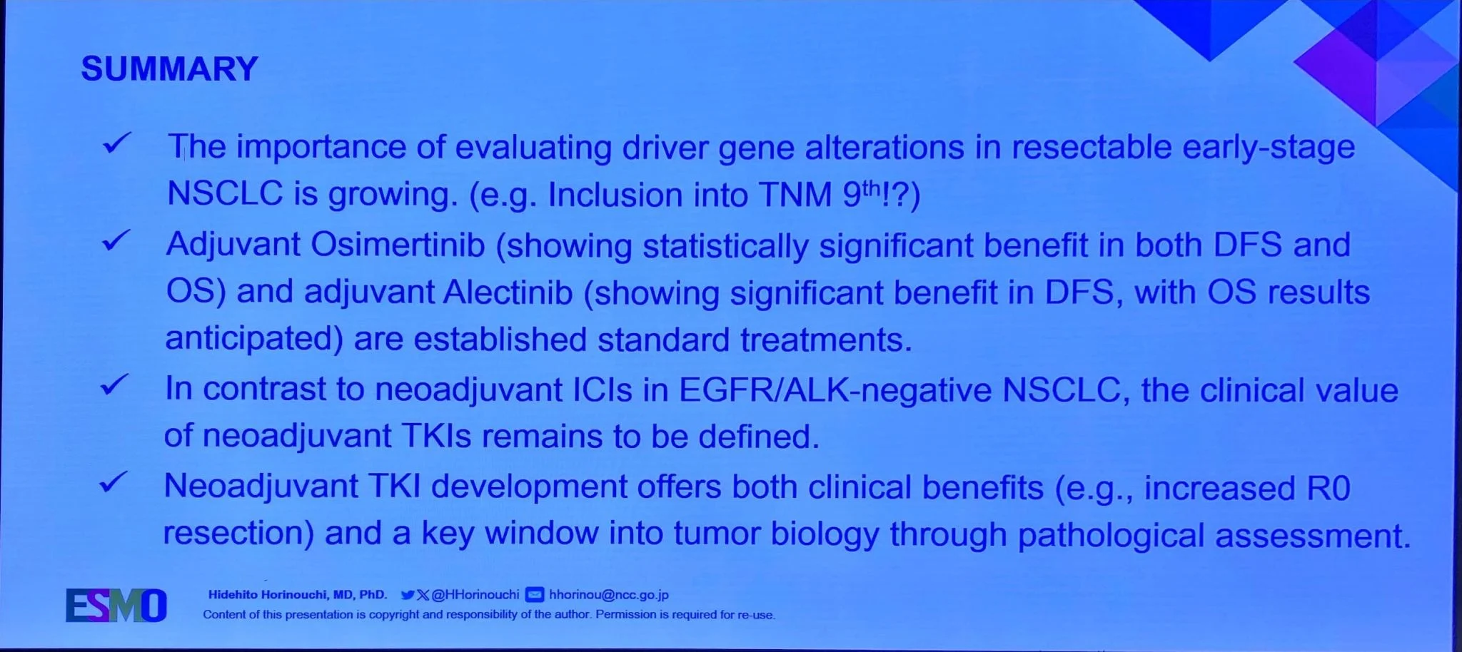 “Very clear and comprehensive presentation on perioperative TKIs by Hidehito Horinouchi. Still many questions, but osimertinib has revolutionized the approach (ADAURA), as it continues to do for EGFRmut advanced stage (FLAURA and FLAURA2 are both the standard of care 1st line).”