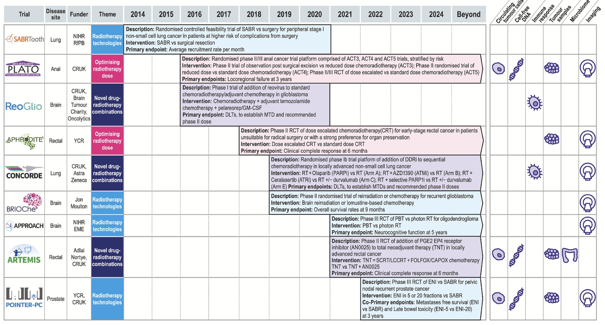 A portfolio of 9 funded trials including 14 studies evaluating radiotherapy dose, novel technology and novel agent drug combinations, funded and supported by Cancer Research UK (CRUK), NIHR (National Institute for Health and Care Research), Medical Research Council, Yorkshire Cancer Research, Adlai Nortye, AstraZeneca, The Brain Tumour Charity, and Jon Moulton.