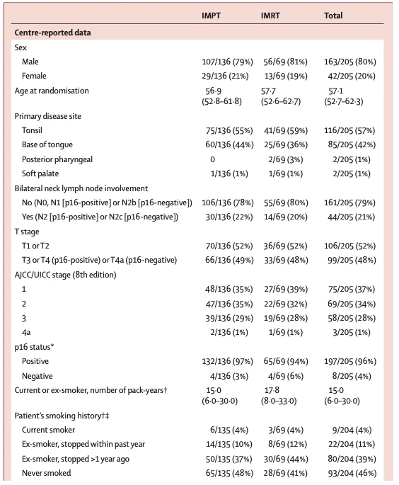 Ultimately, 205 patients were randomized, 136 to IMPT and 69 to IMRT. Key patient characteristics are below.