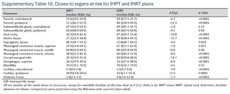 Of note, 61% of all IMPT plans required replanning, versus only 30% in IMRT. That speaks to the work needed to preserve IMPT plan quality over time. I am a huge proponent of adaptive radiotherapy, and even a 30% IMRT replan probability speaks to how frequently plan quality degrades. Can’t wait to see secondary analyses of these interim scans.