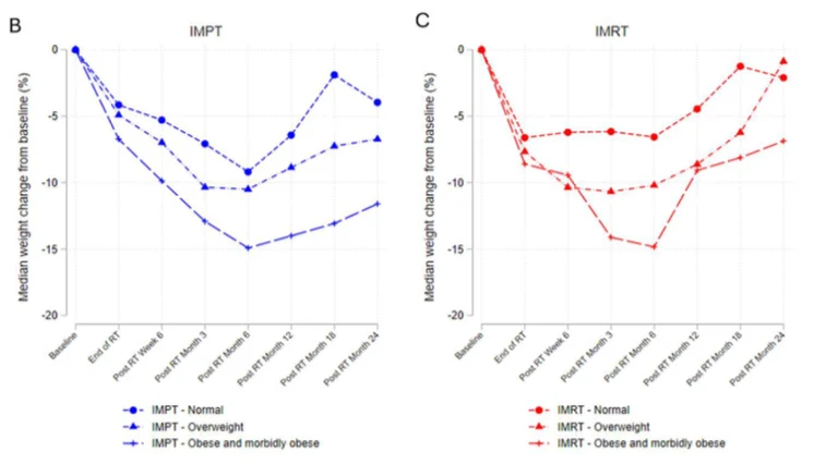 Every pre-treatment BMI cohort preserved more weight over time, though it’s hard to interpret the clinical impact. There were fewer stomach tubes in the IMPT patients, so perhaps that explains the result, and maybe there are some long-term benefits in sustaining the weight loss in overweight/obese patients: hard to know. The results are what they are but do highlight the weight preservation with IMRT.