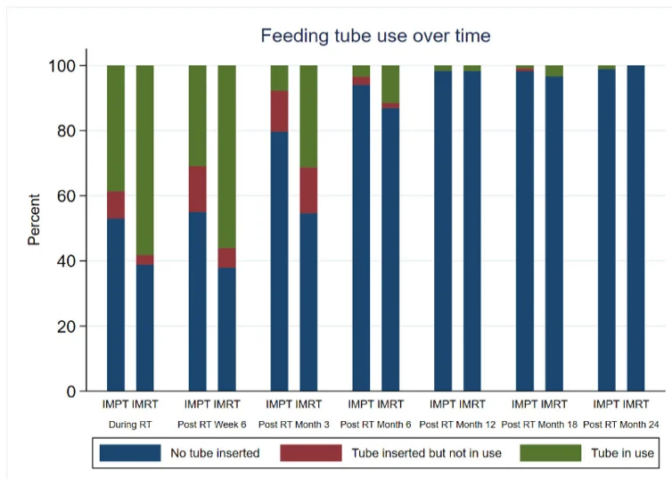 In terms of reactive tubes, the numbers were 14/69 (20%) IMRT patients and 26/135 (19%), so all of a sudden it becomes difficult to interpret feeding tube use!