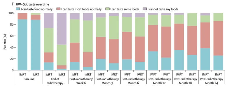 It is important to point out the transient improvement in dysgeusia in the IMPT patients. Both patient-reported (UWQOL taste, see chart) and physician-assessed taste was better in the IMPT patients (42% vs 66% grade 2 dysgeusia acutely, and 16% vs. 26% at 3 months), but there were no differences by 12 months.