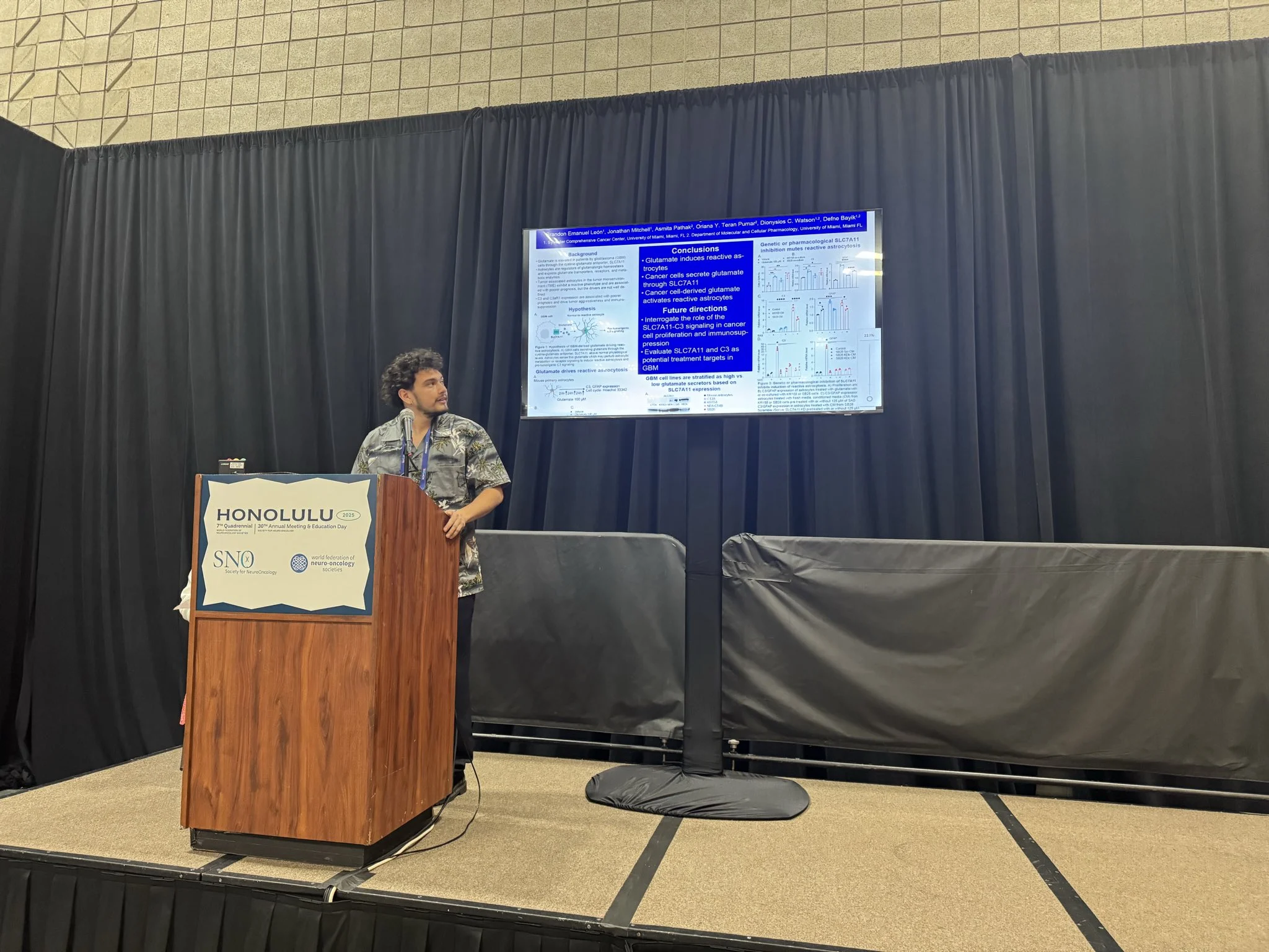 “And closing our SNO2025 presentations with a rapid talk from University of Miami’s Miller School of Medicine PhD student Brandon Leon and a poster presentation from Sylvester Comprehensive Cancer Center postdoc Oriana Teran Pumar on her The V Foundation funded project!”