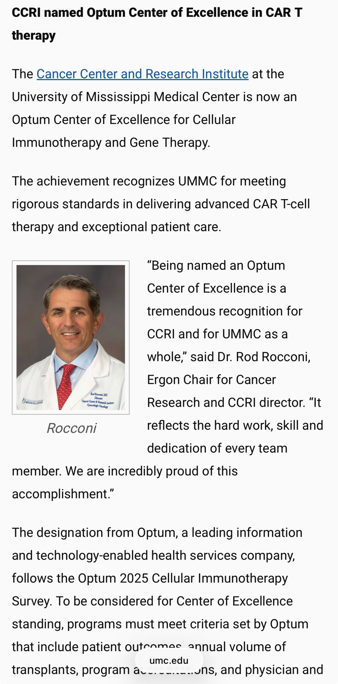 “Sharing these accolades from our DOM news today! So proud of our robust CAR-T/Cellular therapy/BMT program at University of Mississippi Medical Center led by Dr. Milner – we are now named in the Optum’s network of “centers of excellence”.