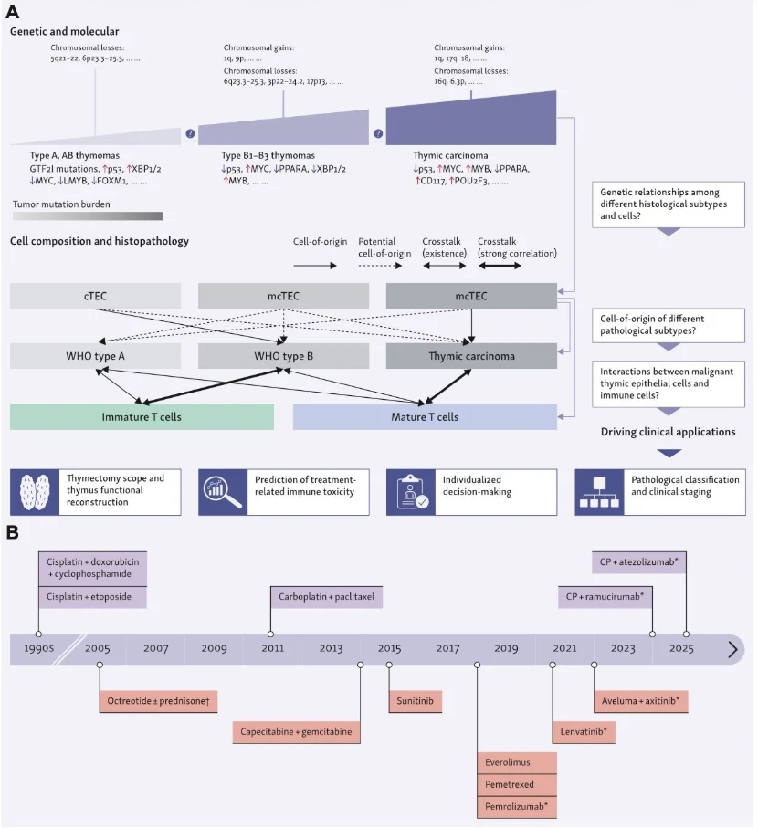 Key advances include the clinical use of immune signatures such as PD-L1 to guide immunotherapy, recognition of inherited cancer risk with an approximately 85% increased lung cancer risk among first-degree relatives, and the growing relevance of germline testing. In mesothelioma, identification of BAP1 and other germline alterations has defined less aggressive variants that benefit from tailored screening and therapy. Progress in thymic tumors has been more modest but recent biological insights are beginning to translate into clinically relevant strategies.