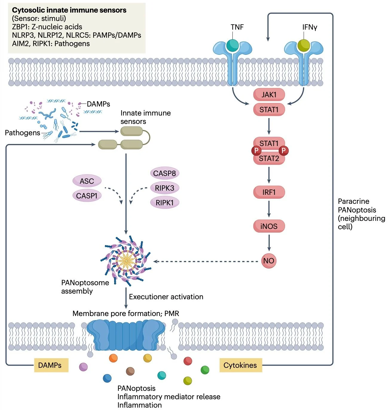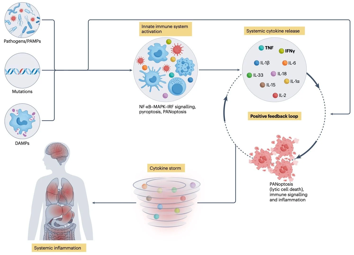Etiologies include infection, auto-inflammatory and autoimmune diseases, monogenic disorders, and therapeutic interventions such as immunotherapy. A conserved mechanism involves aberrant cytokine release amplified by a positive feedback loop between inflammatory signaling and PANoptosis, propagating tissue injury through paracrine cell death and further cytokine production.
