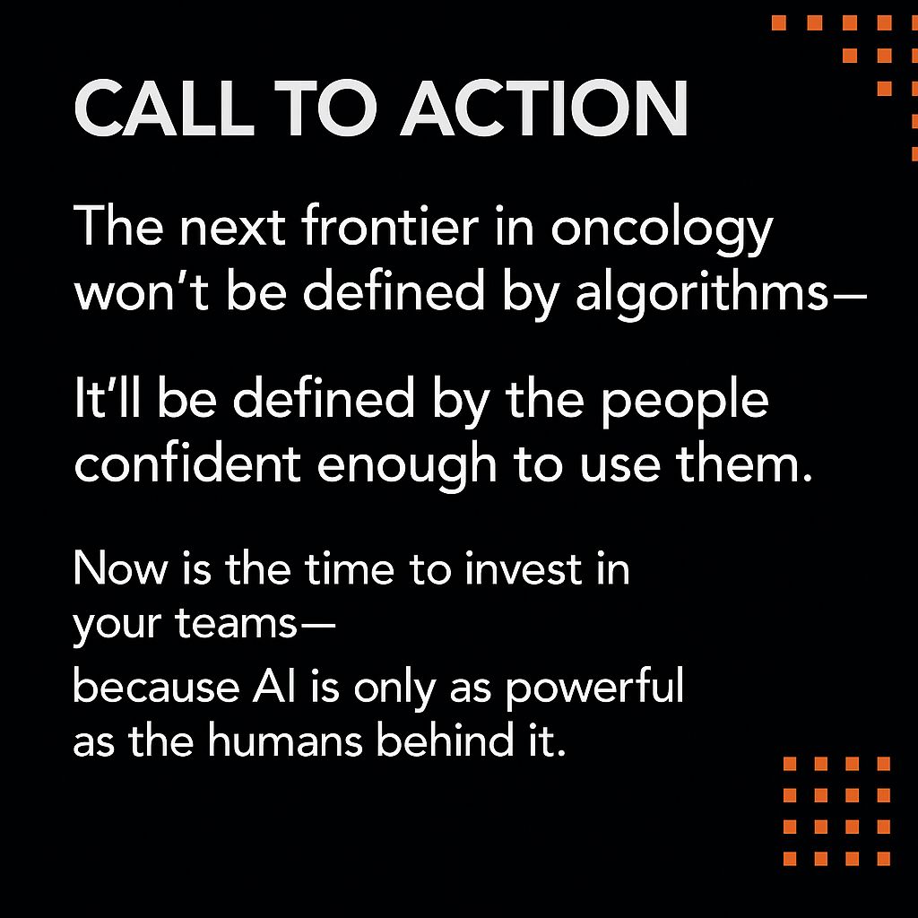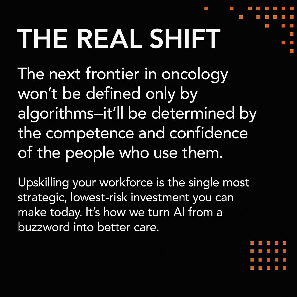 The next frontier in oncology won’t be defined only by algorithms – it’ll be determined by the competence and confidence of the people who use them. Upskilling your workforce is the single most strategic, lowest-risk investment you can make today. It’s how we turn AI from a buzzword into better care.”