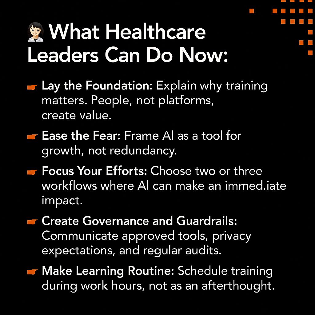- Create Governance and Guardrails: Communicate approved tools, privacy expectations, and regular audits.