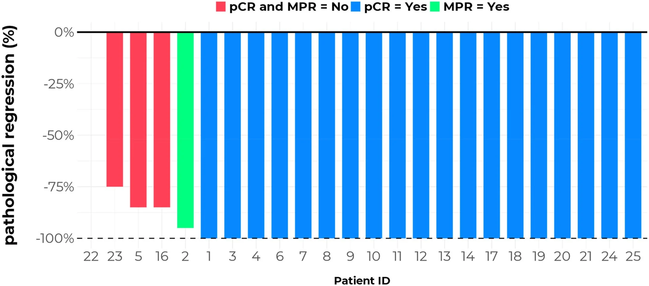 “A phase II study (n=25) reports an 80% pCR rate for stage I NSCLC treated with SBRT plus 3 cycles of pembrolizumab. I’m curious whether the time to surgery (~12 weeks) explains the higher pCR rate compared to MISSILE (10 weeks), and whether the one tumor with 0% response harbored a KEAP1 mutation.”