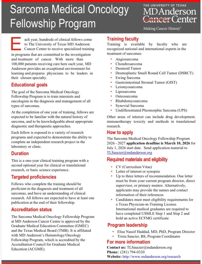 “We’re excited to announce that applications are now open for our 1-year Sarcoma Fellowship starting July 1, 2026 at MD Anderson Cancer Center! Train in high-volume sarcoma care, cutting-edge clinical trials, and translational research.