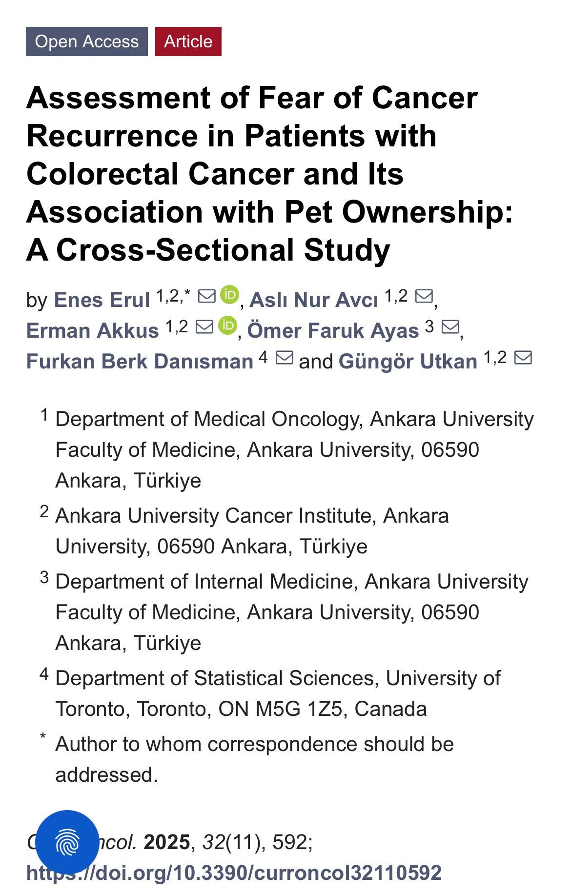 In our study of 167 colorectal cancer survivors, 62% screened positive for high fear of recurrence. We also found something hopeful: pet ownership was associated with ~75% lower odds of high FCR (OR≈0.25) – a small reminder that connection and companionship matter in survivorship.