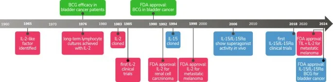 “IL-15 enters bladder cancer. N-803 (Anktiva), an IL-15 superagonist, is now approved with BCG for BCG-unresponsive high-risk NMIBC (CIS ± papillary disease), the first cytokine approved in oncology in >30 years. Editorial revisits the path from IL-2 to IL-15 and what this means for future immunotherapy.”