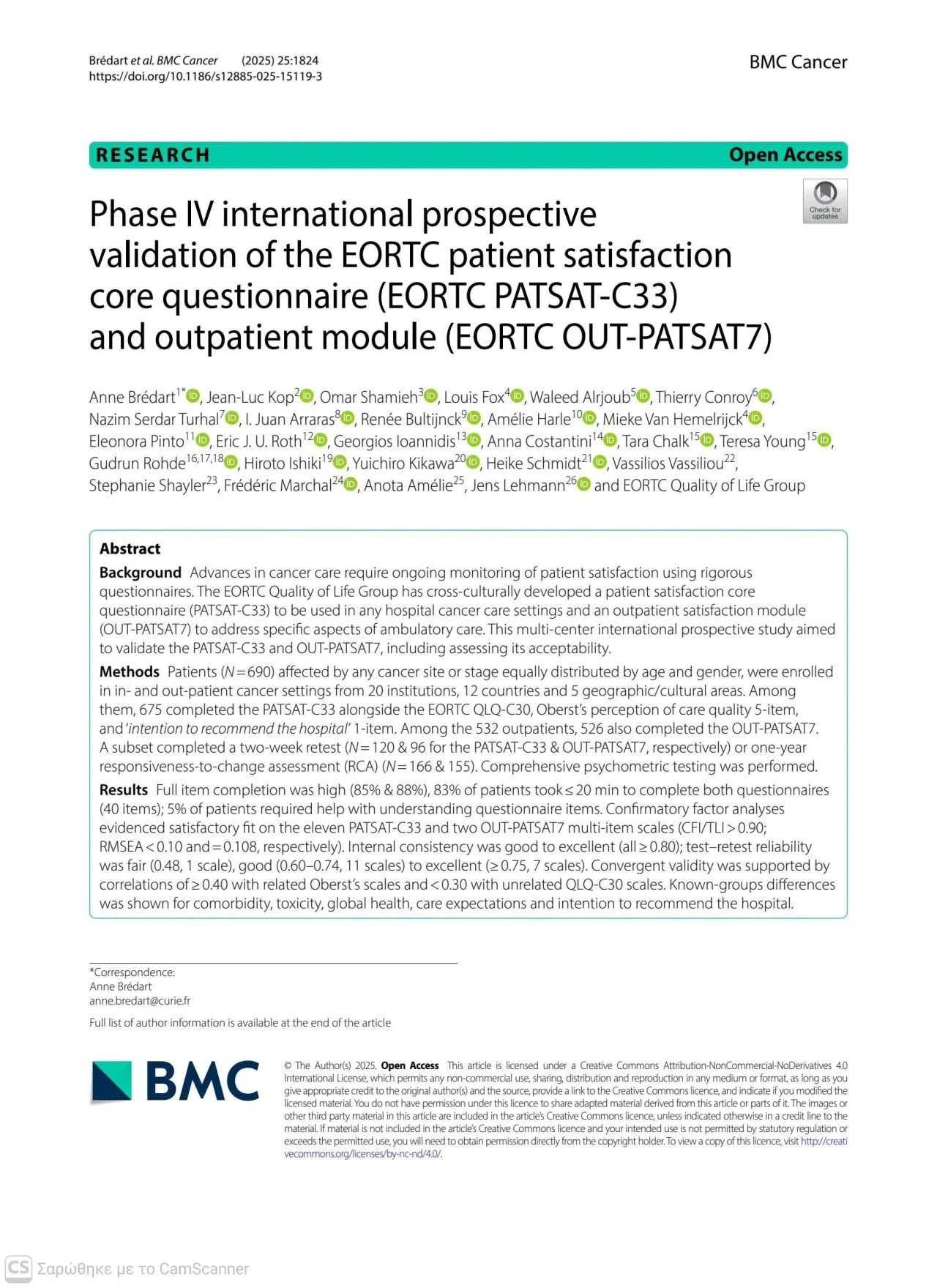 The Oncology Department of Nicosia General Hospital is proud to have contributed to the finalization of these two PROMS through an international multi-center validation study, the results of which are now published in BMC Cancer. Many thanks to Prof. Anne Brédart (Institut Curie) and all the participating centres for their fruitful collaboration.”