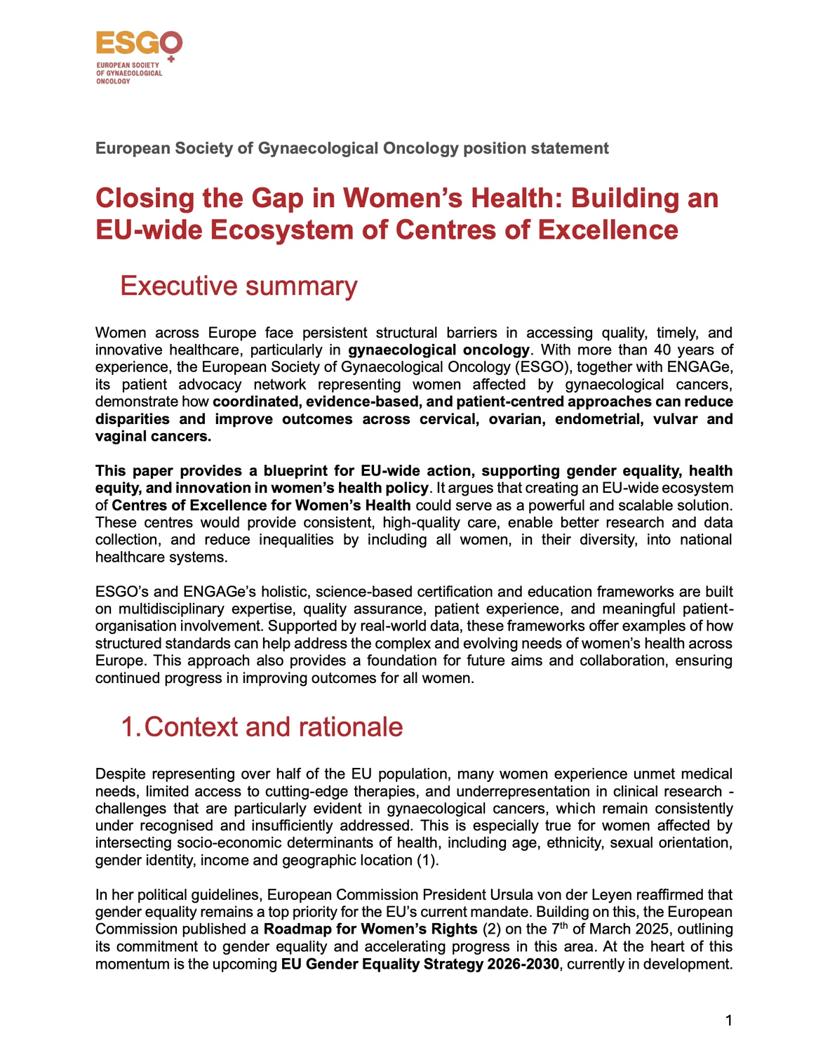 At the centre of the discussion is ESGO’s newly published position paper, ‘Closing the Gap in Women’s Health: Building an EU-wide Ecosystem of Centres of Excellence‘, which sets out a clear call to action for EU institutions, Member States, and stakeholders. The paper calls for: