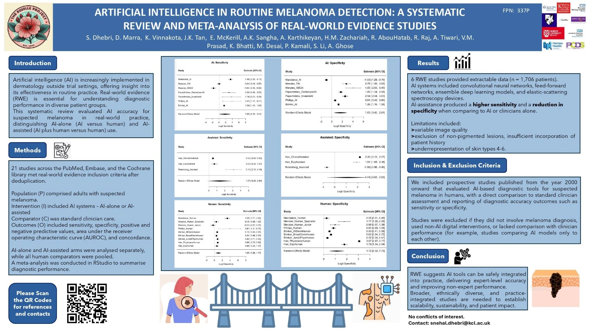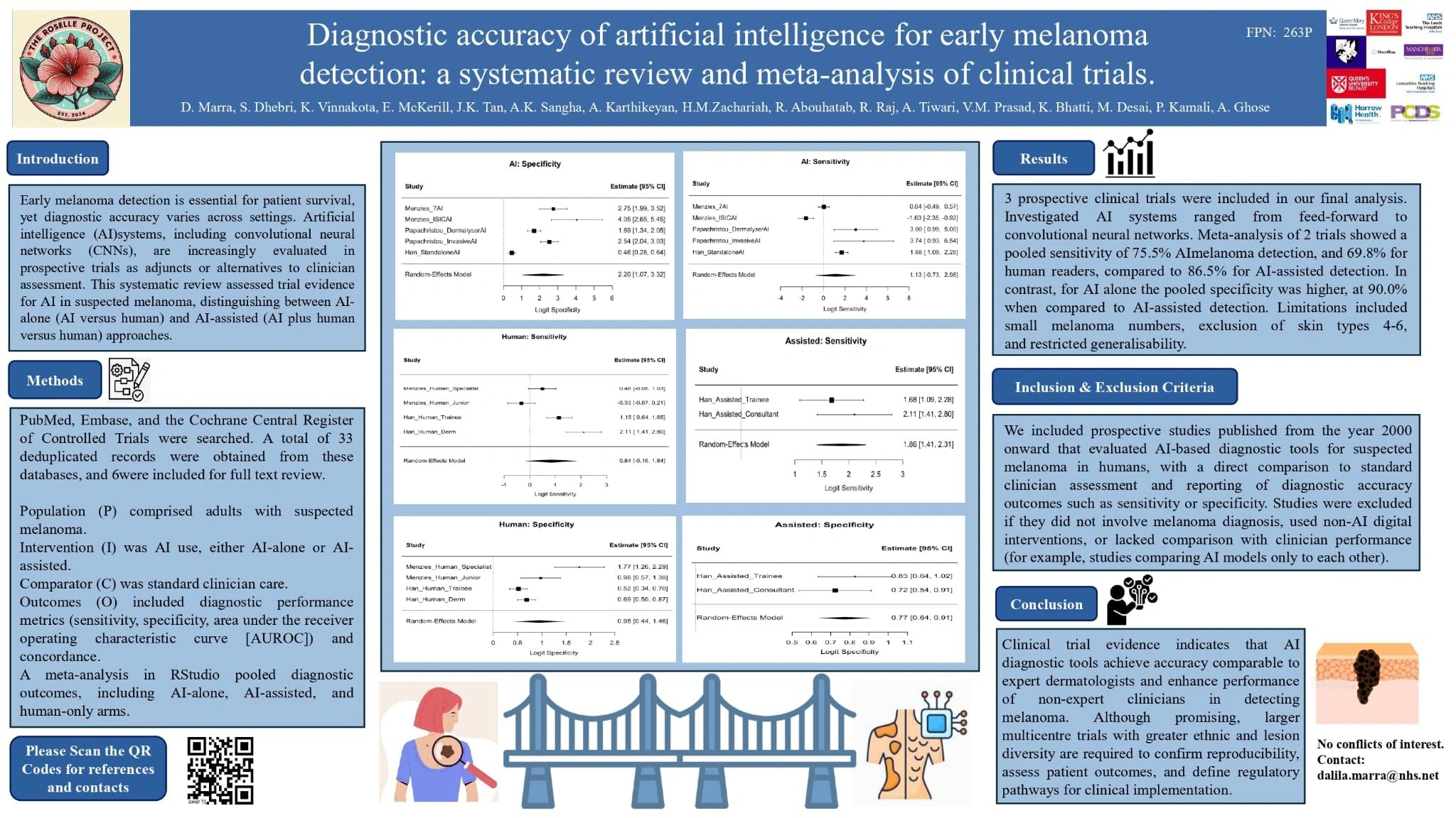 By conducting a systematic review and meta-analysis, we aimed to explore the potential for AI as an early detection tool for melanoma by synthesizing evidence from both clinical trials and real-world evidence. By analysing AI-alone and AI-assisted approaches separately, the study provides a nuanced understanding of how AI functions outside controlled trial environments.