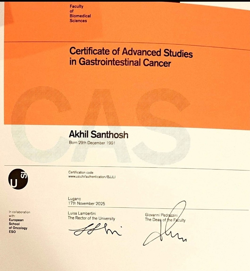 “Happy to share that I have received the ‘Certificate of advanced studies’ CAS in Gastro-intestinal oncology, from European School of Oncology. Eternally grateful to all my teachers and mentors, Sara De Dosso and Gopika Sali.”