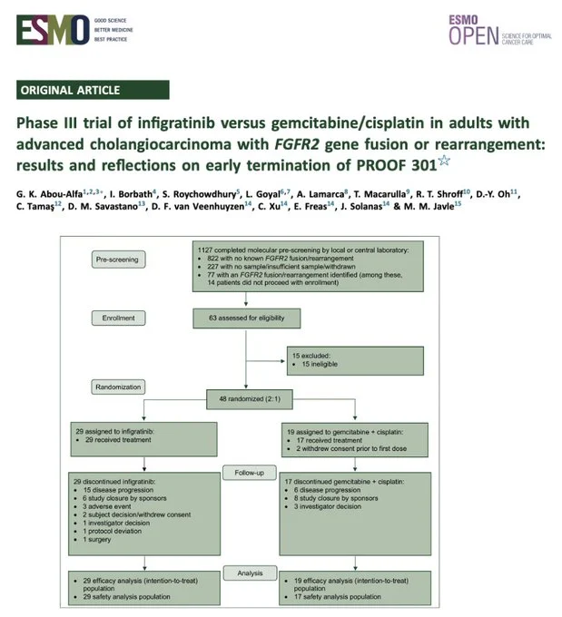 “Ph3 trial of infigratinib vs gem/cis in advanced CCA with FGFR2 fusion/rearrangement: results and reflections on early termination of PROOF 301 in ESMO Open.