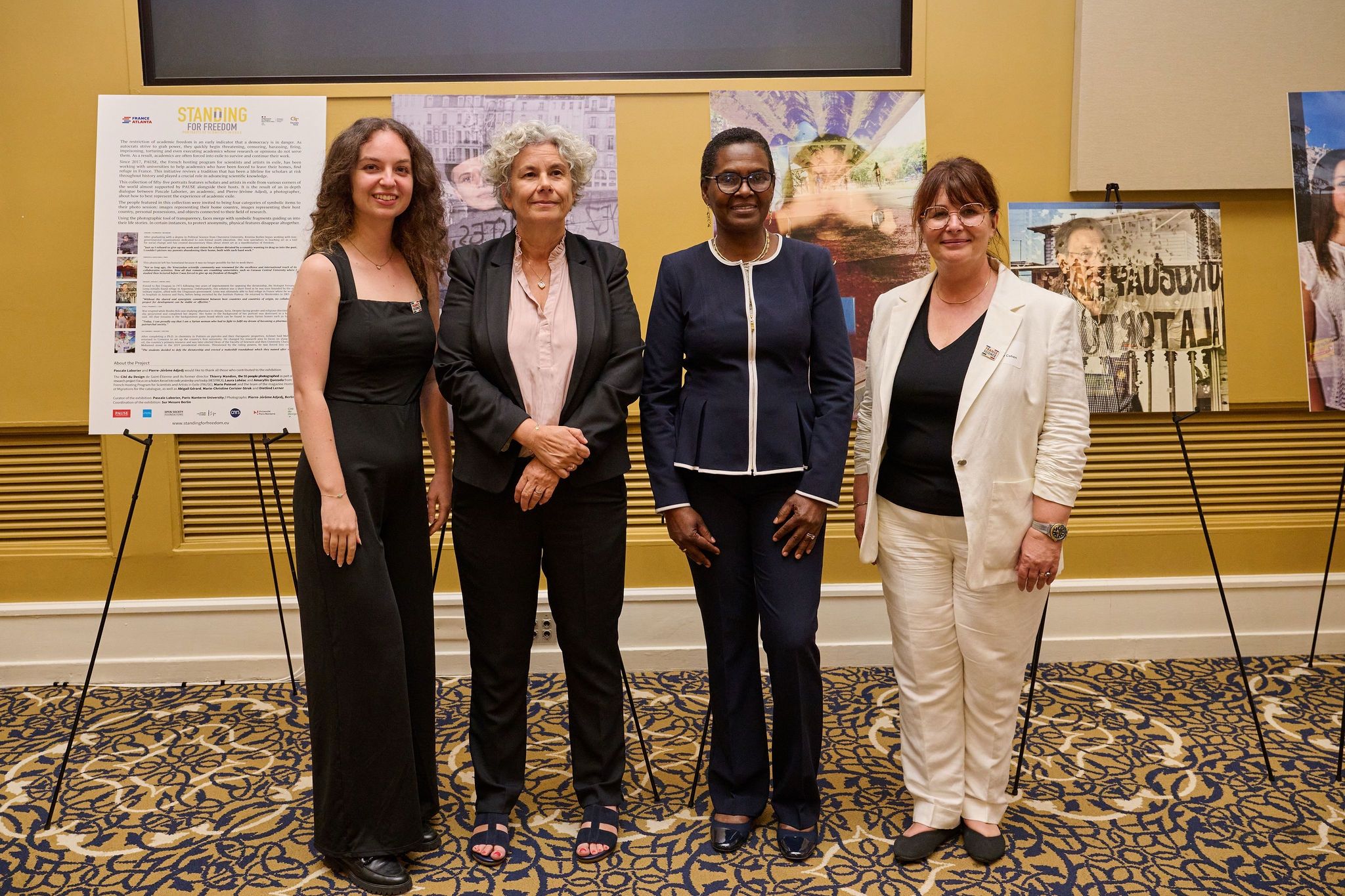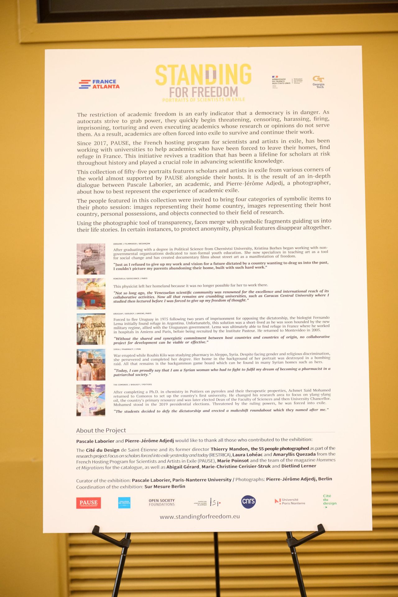 The reception also featured Poser pour la Liberté / Standing for Freedom, an exhibition portraying scholars forced to leave their countries due to persecution, conflict, or human rights abuses, and welcomed in France. We extend our warm thanks to its co-author and curator, Pascale Laborier, who joined us last night.”