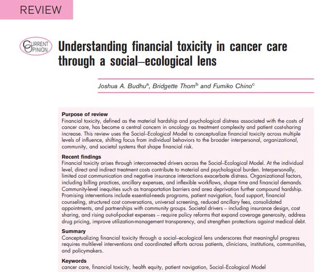 “Financial toxicity interventions from patient to provider to policy. Ultimately, sustainable solutions must occur at the societal level, where structural reforms in financing, transparency, and consumer protection can promote greater equity and safeguard pt financial well being.