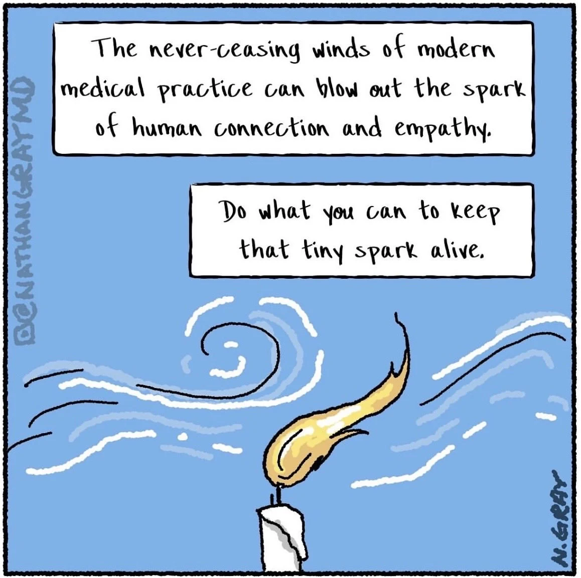 We cry together w/good news (end of tx) and sometimes w/bad news (cancer progression/uncontrolled sx). Appreciated this new comic by Dr Nathan A. Gray on Instagram.”