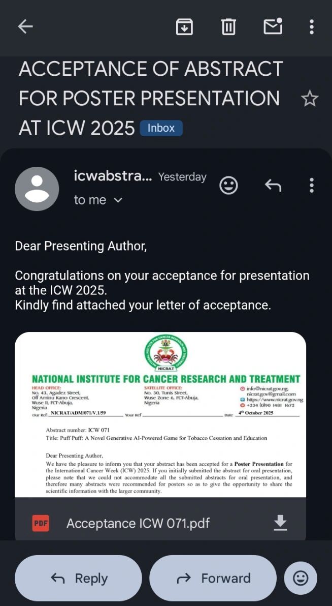 “I’m thrilled to share that our abstract titled, ‘Puff Puff: A Novel Generative AI-Powered Game for Tobacco Cessation and Education’ has been accepted for poster presentation at the International Cancer Week (ICW) 2025.