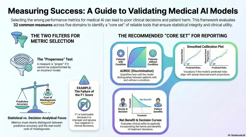 - A performance measure is ‘proper’ only if its expected value is optimised when the model provides the correct probabilities. Shockingly, the study found that 13 out of 32 measures are improper, including the widely used F1 score, which fails to account for clinically relevant decision thresholds and conflates statistical performance with clinical utility.