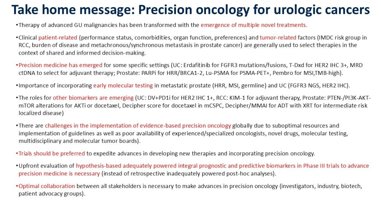 1) Precision medicine has emerged for some specific settings (UC: Erdafitinib for FGFR3 mutations/fusions, T-Dxd for HER2 IHC 3+, MRD ctDNA to select for adjuvant therapy; Prostate: PARPi for HRR/BRCA1-2, Lu-PSMA for PSMA-PET+, Pembro for MSI,TMB-high);