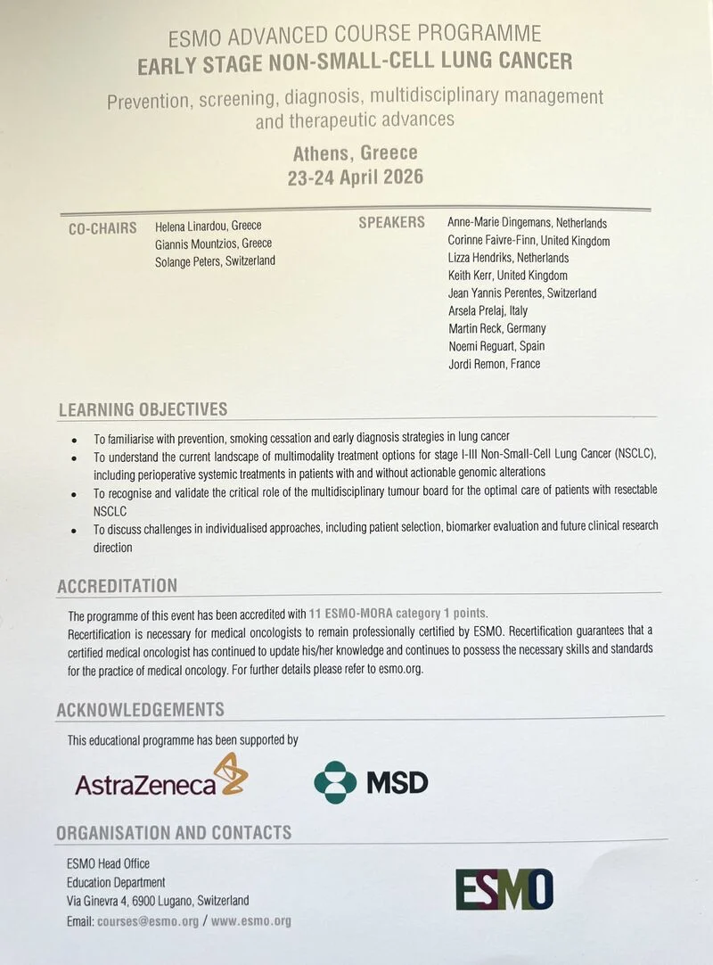 “These last days, we had the privilege of hosting the ESMO – European Society for Medical Oncology Advanced Course on early lung cancer- for the 2nd year in a row in Athens! two intense and inspiring days of learning, discussion, and true academic exchange.