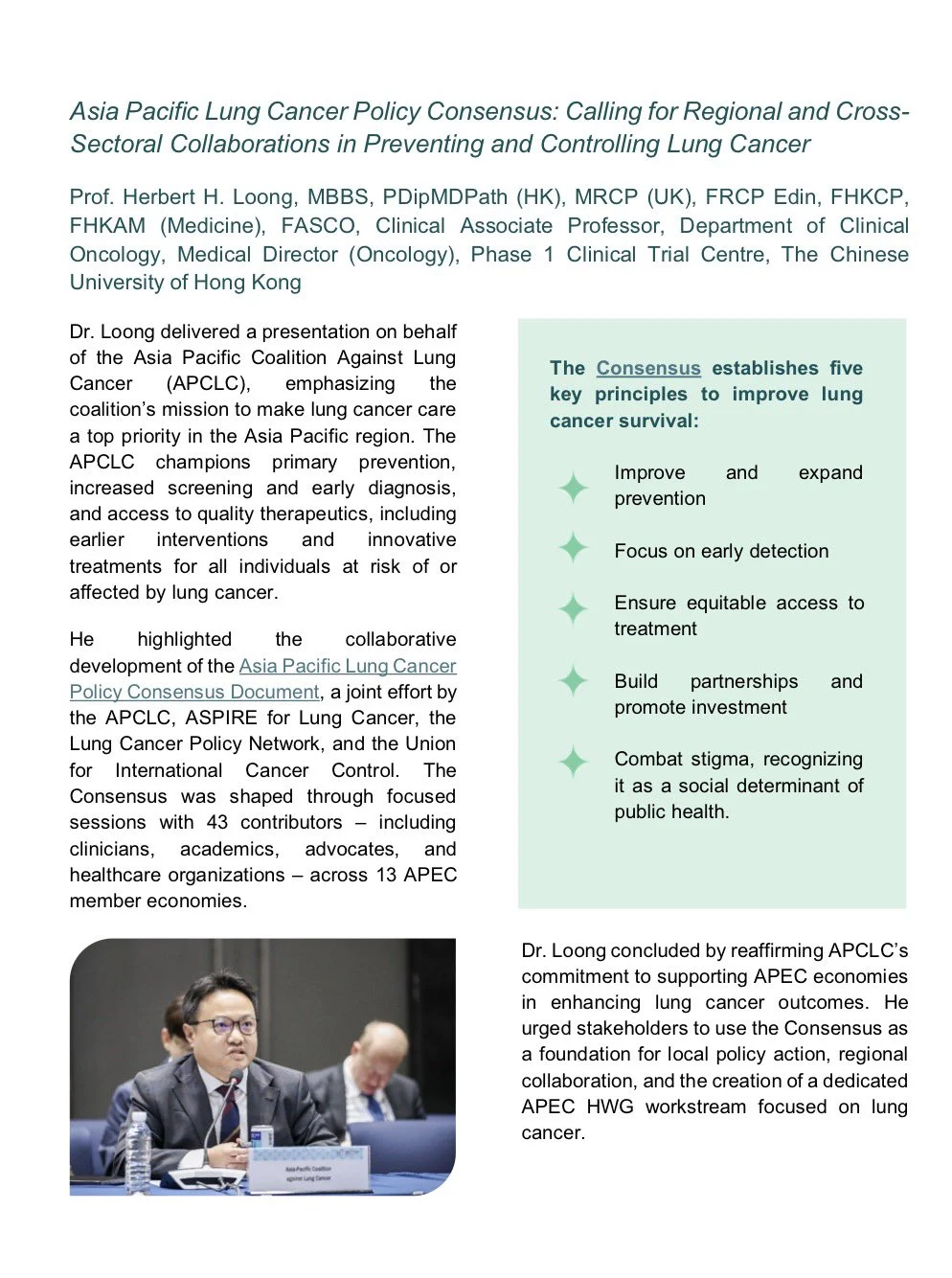 “We are pleased to see contributions from our Members in the Asia-Pacific Economic Cooperation policy dialogue, which focuses on how to address access gaps across the lung cancer care continuum.”