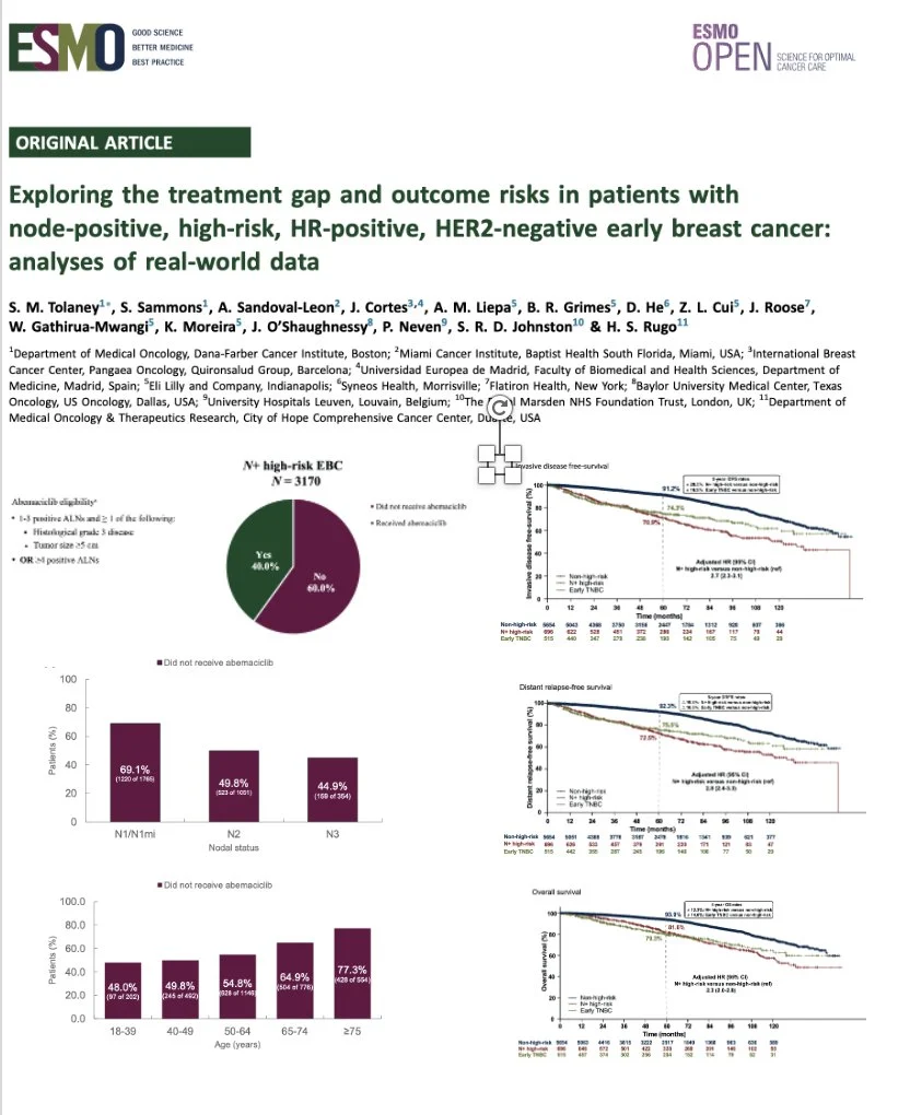“Exploring the treatment gap and outcome risks in patients with node+, high-risk, HR+, HER2- early BC: analyses of RW data in ESMO Open. Only 40% of eligible pts received adj abemaciclib. Eligible not treated: similar TNBC recurrence/mortality risk.”
