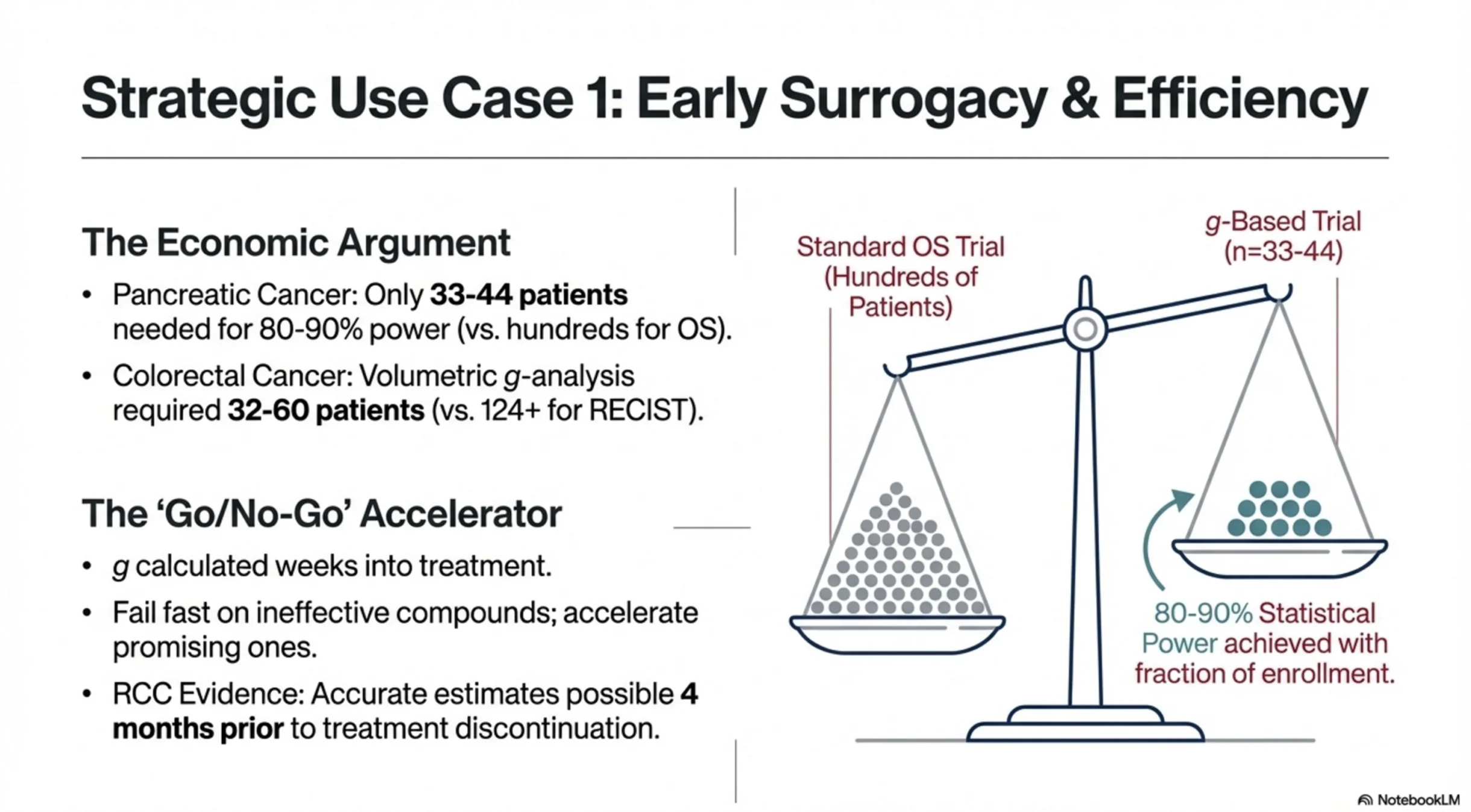 2. Earlier answers, with fewer patients. “g” complements “ORR” as a continuous variable rather than a binary one. In pancreatic cancer, modeling suggested that ~33–44 patients could detect treatment differences with 80–90% power, compared with hundreds typically required for OS. That’s not just about cost or efficiency — it’s about getting meaningful answers to patients sooner.