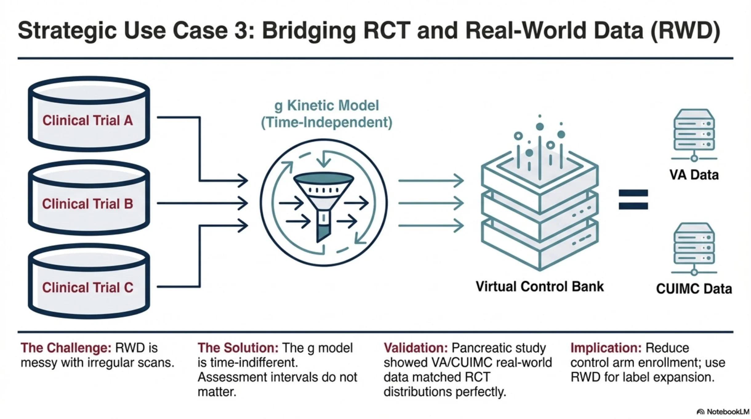 3. A credible bridge between trials and real-world data. The model is insensitive to scan timing intervals, which addresses one of the biggest challenges in real-world evidence: inconsistent assessments due to different measurement intervals. If this continues to hold up, g could become a genuine bridge between clinical trial efficacy and real-world effectiveness — including external controls and synthetic comparators.