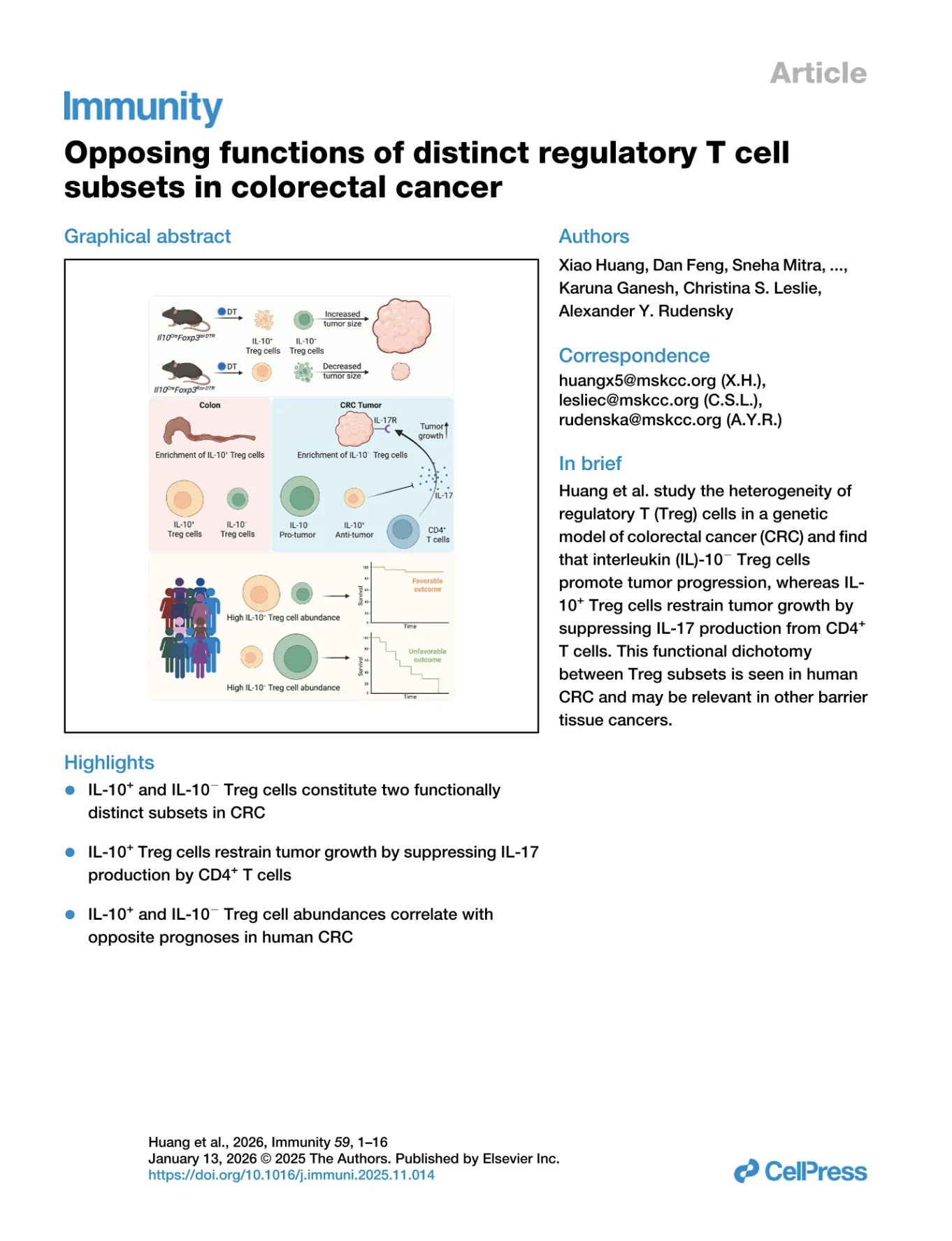 Selective depletion of interleukin-10-expressing (IL-10⁺) Treg cells promoted tumor growth by lifting the restraint on IL-17 production from effector CD4+ T cells, thereby directly stimulating tumor cell proliferation; depletion of IL-10− Treg cells led to pronounced tumor regression. In human CRC, IL-10⁺ and IL-10− Treg abundance correlated with favorable and unfavorable prognosis, respectively. Accordingly, IL-10⁺ and IL-10− Treg cells exhibited opposite enrichment patterns in adjacent normal colon tissues and tumors.