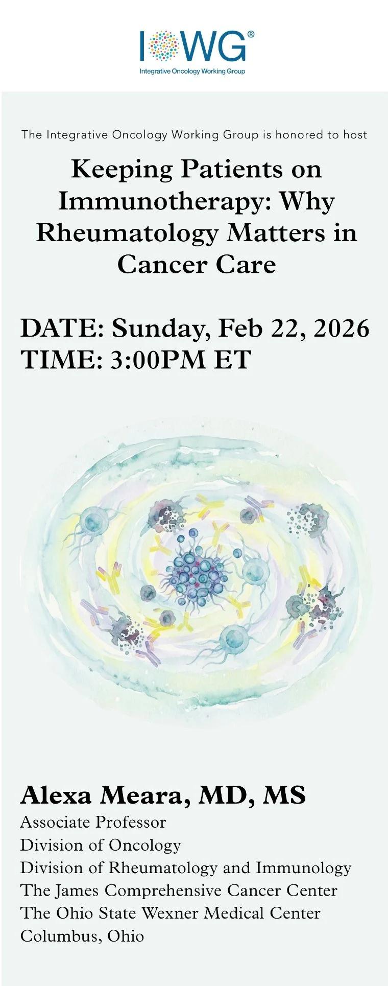 “The Integrative Oncology Working Group is honored to host Alexa Meara, MD, MS—a rheumatologist and Associate Professor in the Division of Oncology at The Ohio State University, and a pioneer in integrating rheumatology into cancer care to help patients safely remain on immunotherapy.