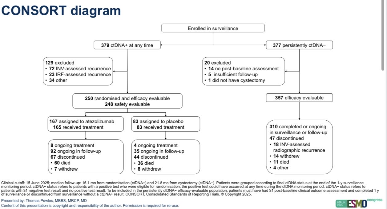 The hypothesis germinated from the negative ImVigor010 trial (see in figure) where we showed only the ctDNA positive subgroup benefited from adjuvant atezolizumab.