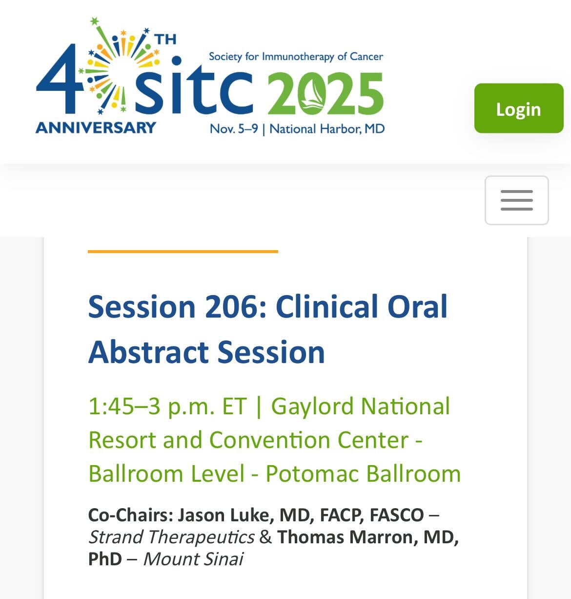 “This week Strand Therapeutics CMO Jason Luke is leading the Society for Immunotherapy of Cancer 40th Annual Meeting! He will be voting on the Board of Directors, Lecturing on the future of TCR therapeutics and Chairing a session on late breaking clinical abstracts.