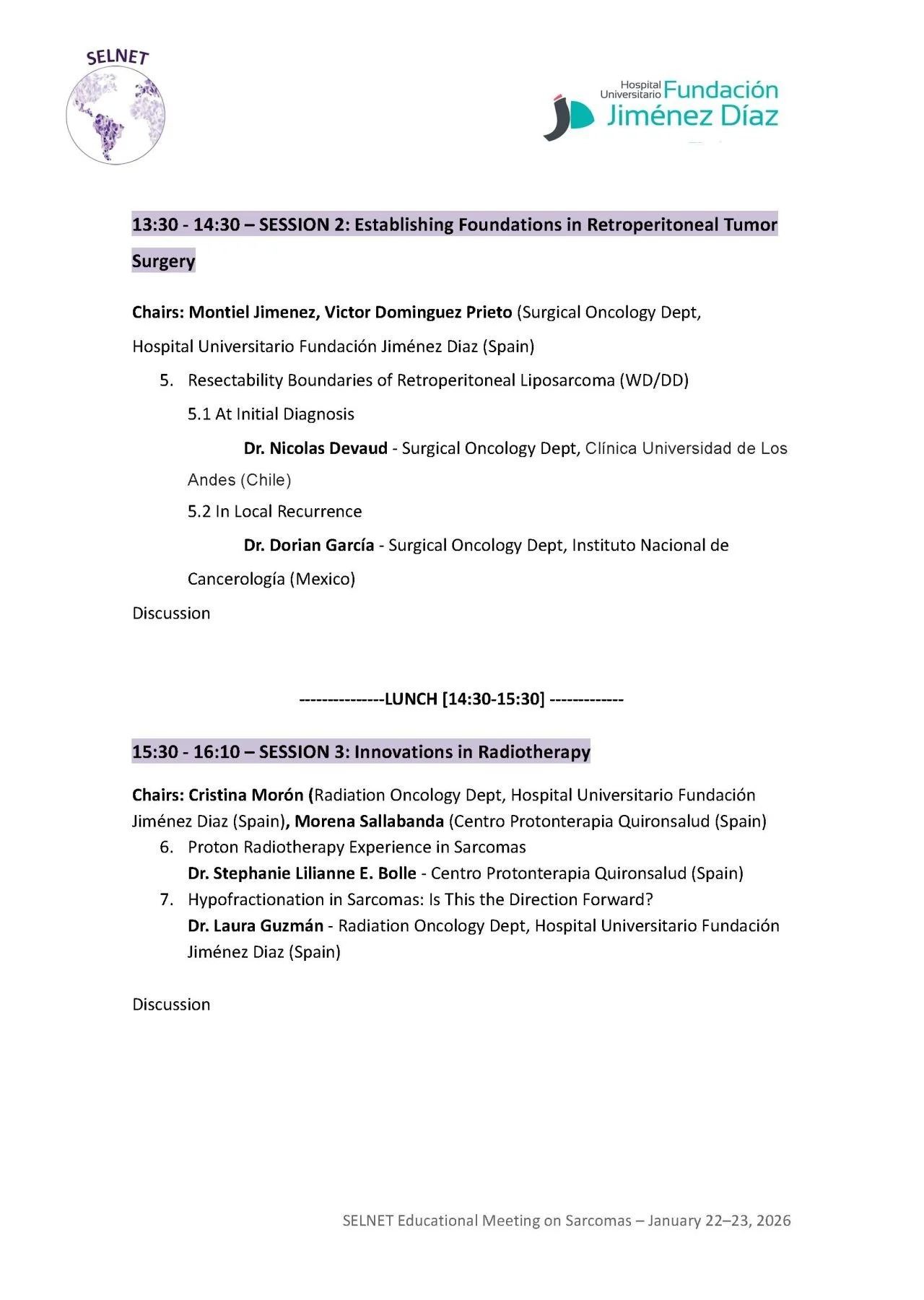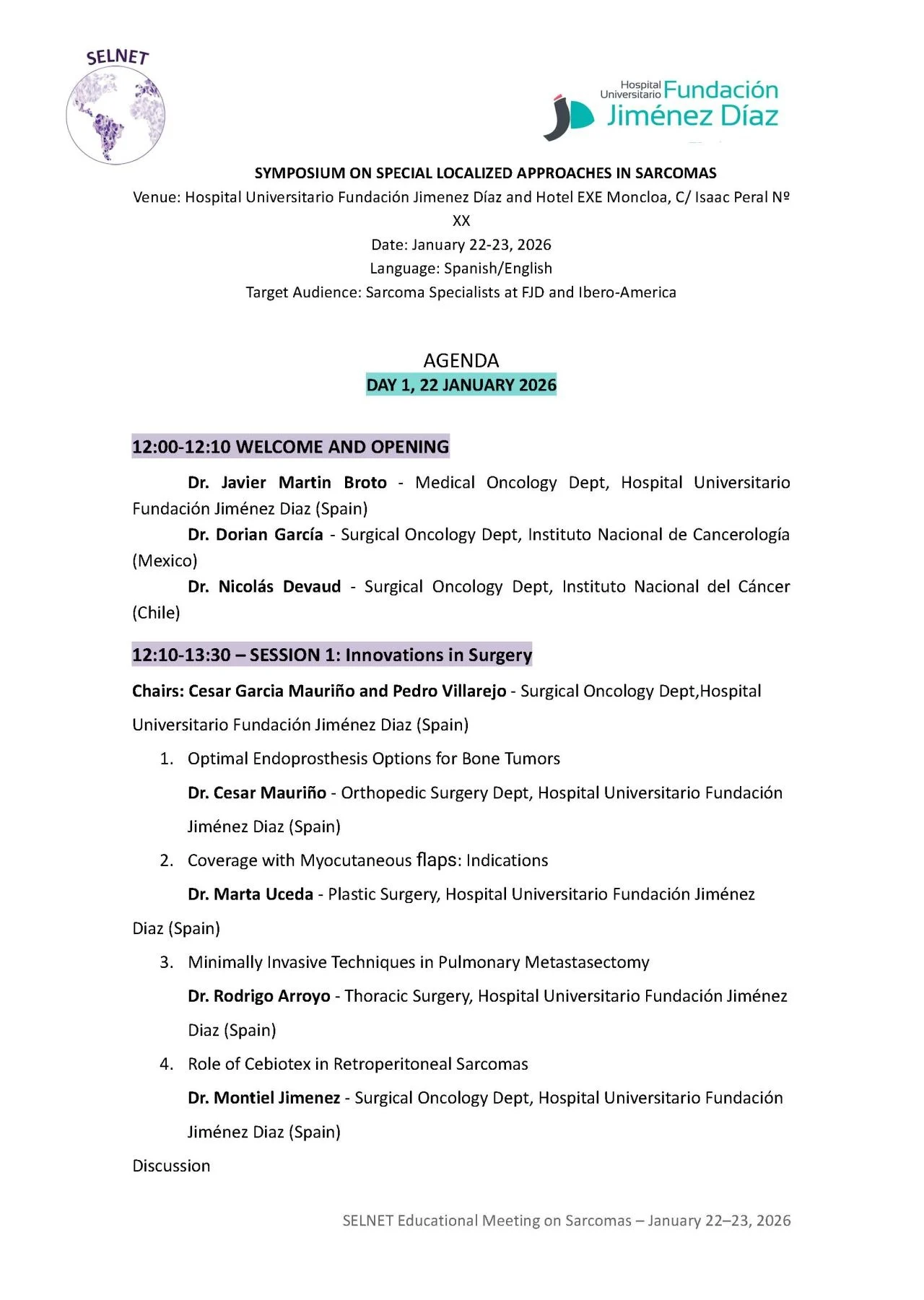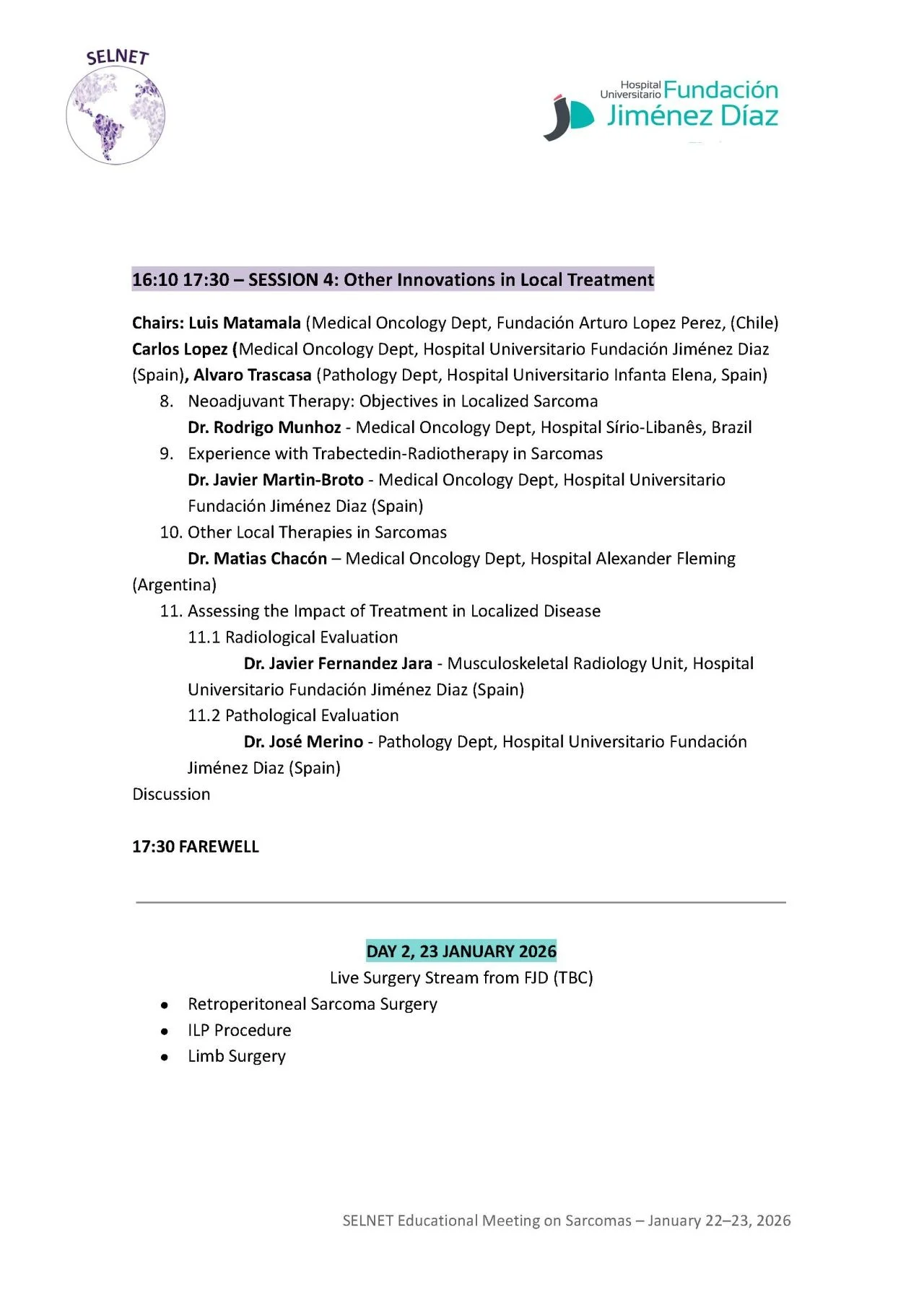 “On January 22nd and 23rd, we had the privilege of diving into the importance of local therapies for patients with sarcomas. The symposium, organized by the Sarcoma Committee of Fundación Jimenez Díaz University Hospital and SELNET, brought together leading experts in the field: Dr. Dorian García from Mexico City, Nicolas Devaud from Santiago, Rodrigo Muñoz from São Paulo, and Matias Chacón from Buenos Aires.