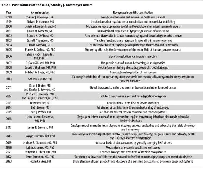 The Stanley J. Korsmeyer award recognizes the outstanding achievements of ASCI members in advancing knowledge in a specific field and in mentoring future generations of life science researchers. The recognition, which was first known as the ASCI Award, was renamed in 2006 in honor of Dr. Stanley J. Korsmeyer, a dedicated and accomplished physician-scientist and mentor who was the first recipient in 1998 and who passed away in 2005. The recipient of the annual Award is provided with a $20,000 honorarium.