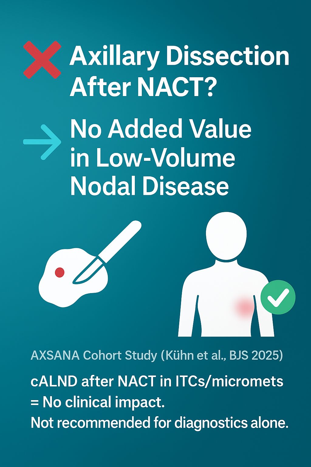 The findings the international multicentre AXSANA cohort study (Kühn et al., BJS 2025) shows that completion axillary lymph node dissection (cALND) after neoadjuvant chemotherapy in patients with isolated tumour cells or micrometastases provides no added clinical value—despite frequent nodal upstaging, it did not alter systemic treatment decisions.