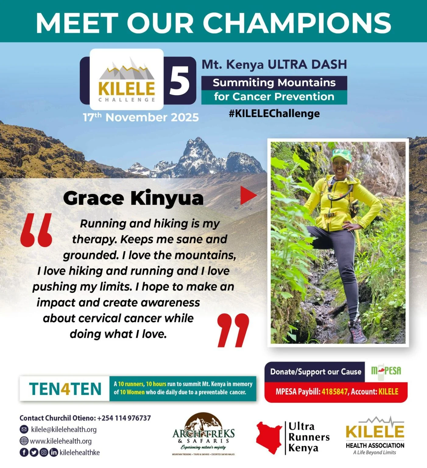 “Grace Kinyua summited Mt. Kenya driven by the belief that movement is therapy. For her, hiking and running are grounding, healing, and a way to push personal limits while using the mountains as a platform to raise awareness on hashtag#CervicalCancer prevention and early detection.
