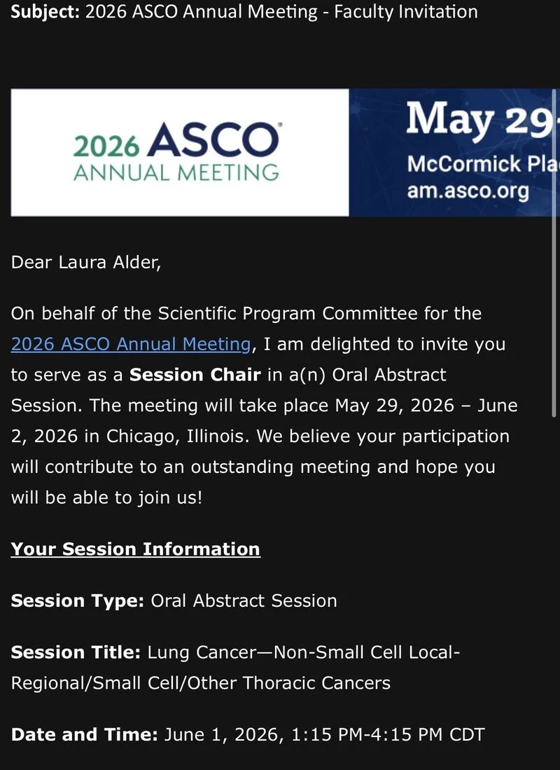“Honored to serve as a Session Chair for the Oral Abstract Session on Lung Cancer-Non-Small Cell Local-Regional/Small Cell/Other Thoracic Cancers at ASCO26!