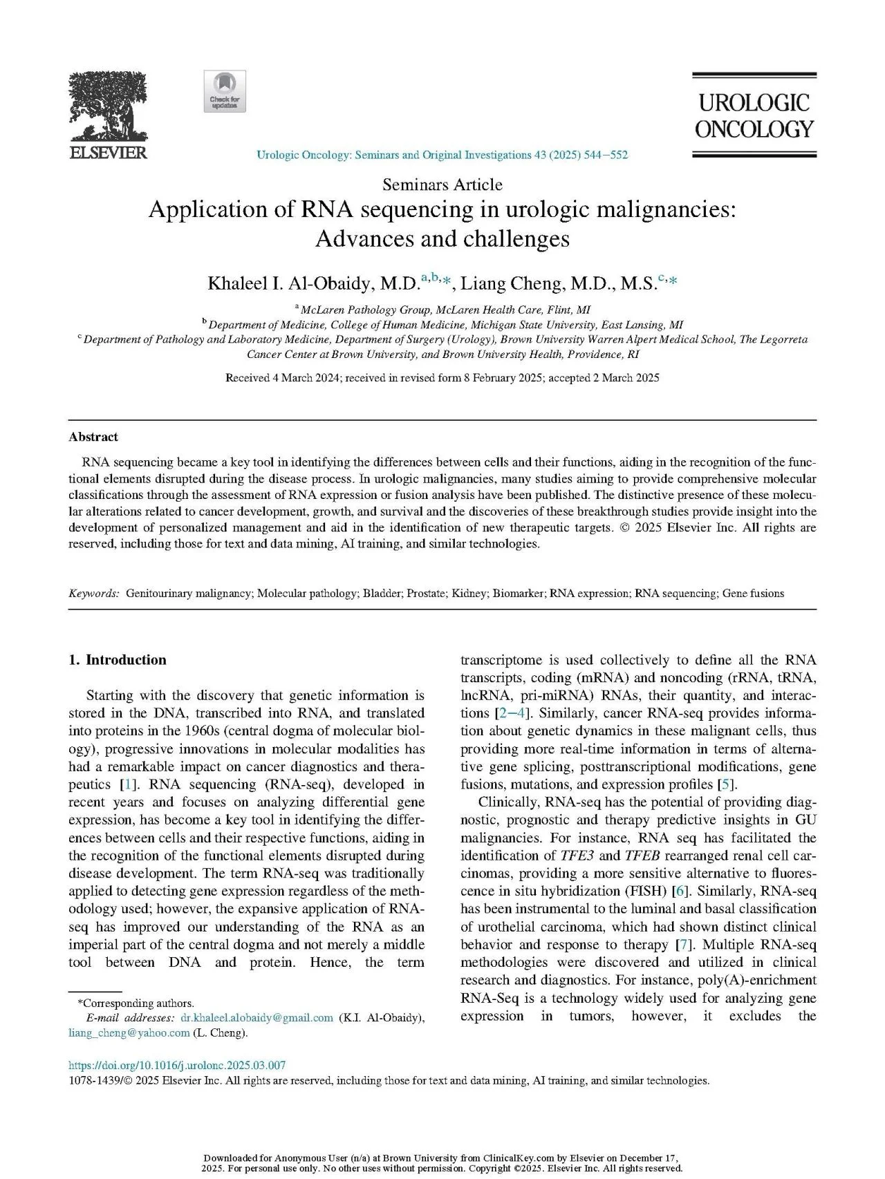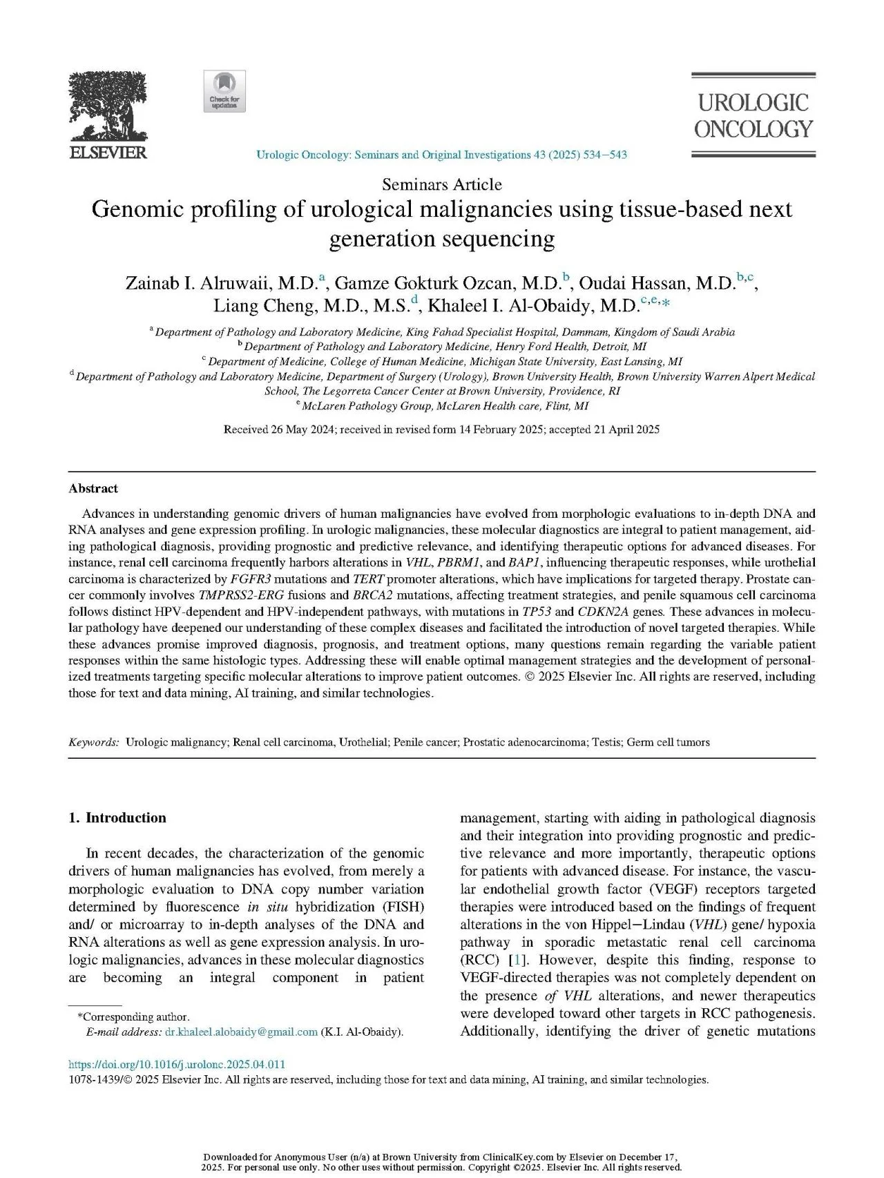 The third review, by Drs. Khaleel Al-Obaidy, Zainab Alruwaii, and colleagues, focuses on tissue-based next-generation sequencing for genomic profiling of urologic malignancies. This article synthesizes current knowledge of actionable genomic alterations across renal cell carcinoma, urothelial carcinoma, prostate cancer, and rarer GU tumors, highlighting how NGS informs diagnosis, prognosis, targeted therapy selection, and clinical trial enrollment. The authors also discuss limitations of tissue-based testing and the importance of thoughtful integration with complementary molecular modalities (Alruwaii Z, Ozcan GG, Hassam O, Cheng L, Al-Obaidy K. Genomic profiling of urological malignancies using tissue-based next generation sequencing. Urol Oncol 2025;43:534-543. PMID: 40410007).”