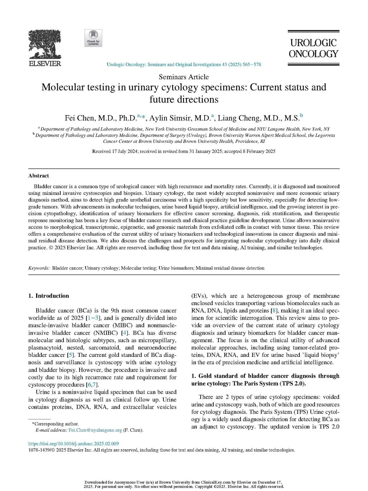 In another important review, Dr. Fei Chen and colleagues provide a comprehensive overview of molecular testing in urinary cytology specimens, emphasizing urine as a powerful, noninvasive substrate for precision oncology. The article summarizes current and emerging DNA-, RNA-, methylation-, and extracellular vesicle–based assays, discusses their clinical utility in bladder cancer detection and surveillance, and outlines future directions including minimal residual disease detection and integration with artificial intelligence. This work underscores the expanding role of urine-based liquid biopsy in routine urologic practice (Chen F, Simsir A, Cheng L. Molecular testing in urinary cytology specimens: Current status and future directions.